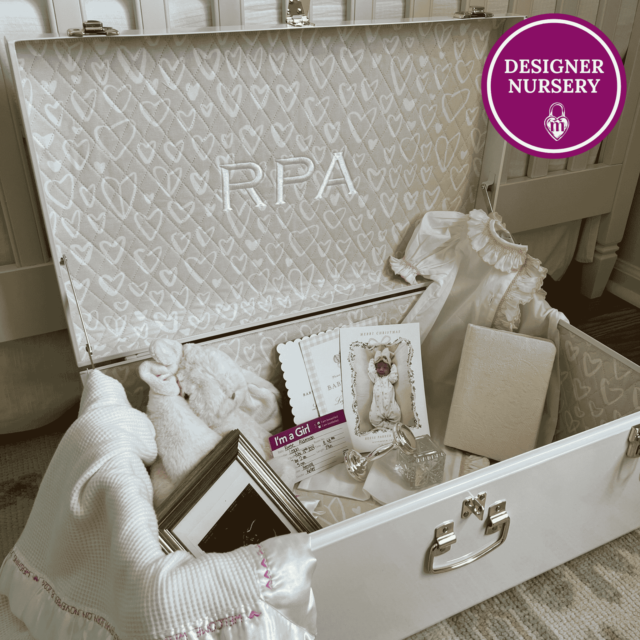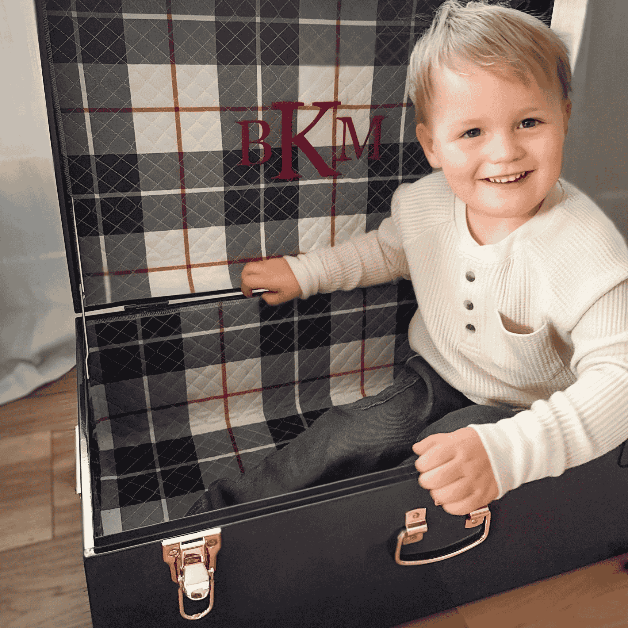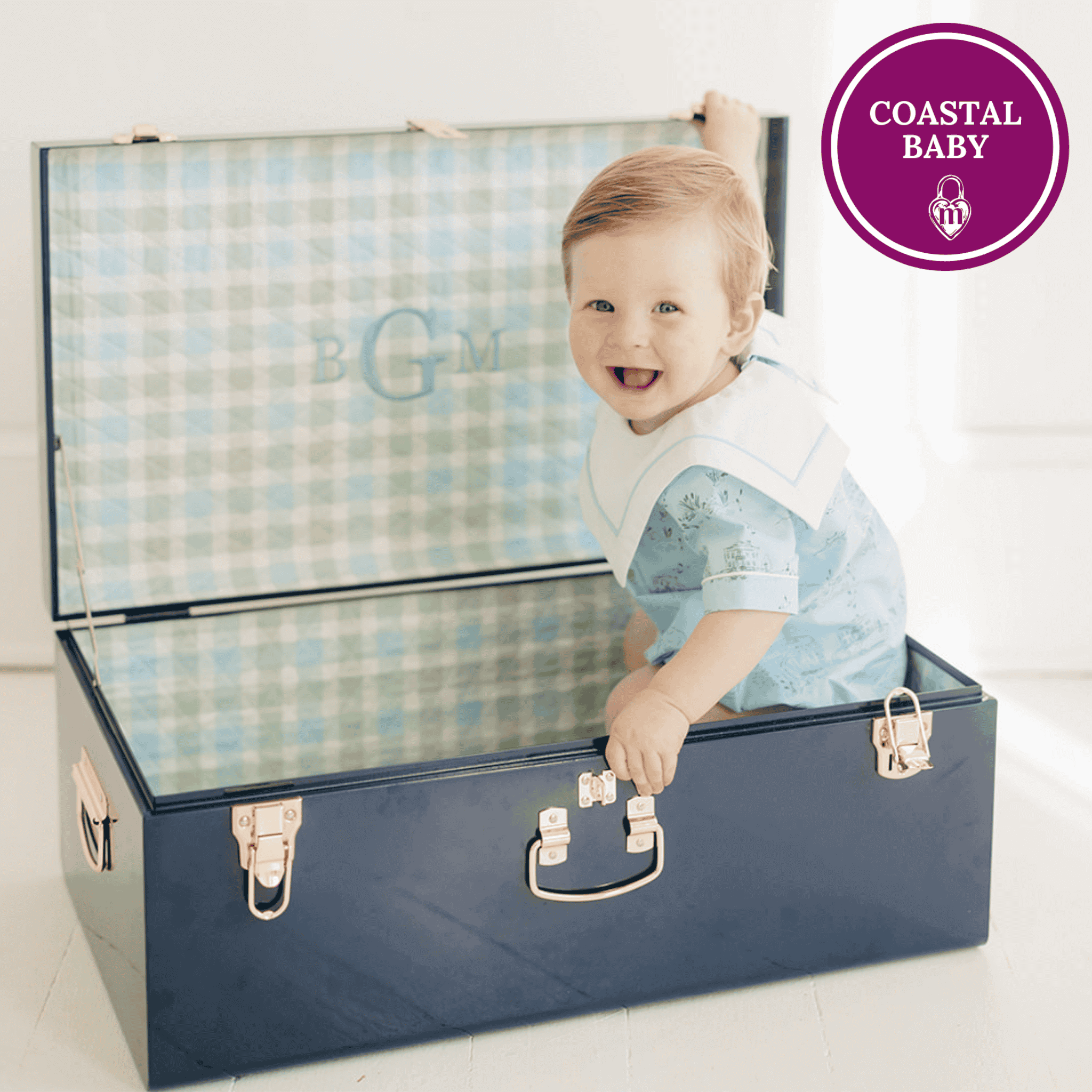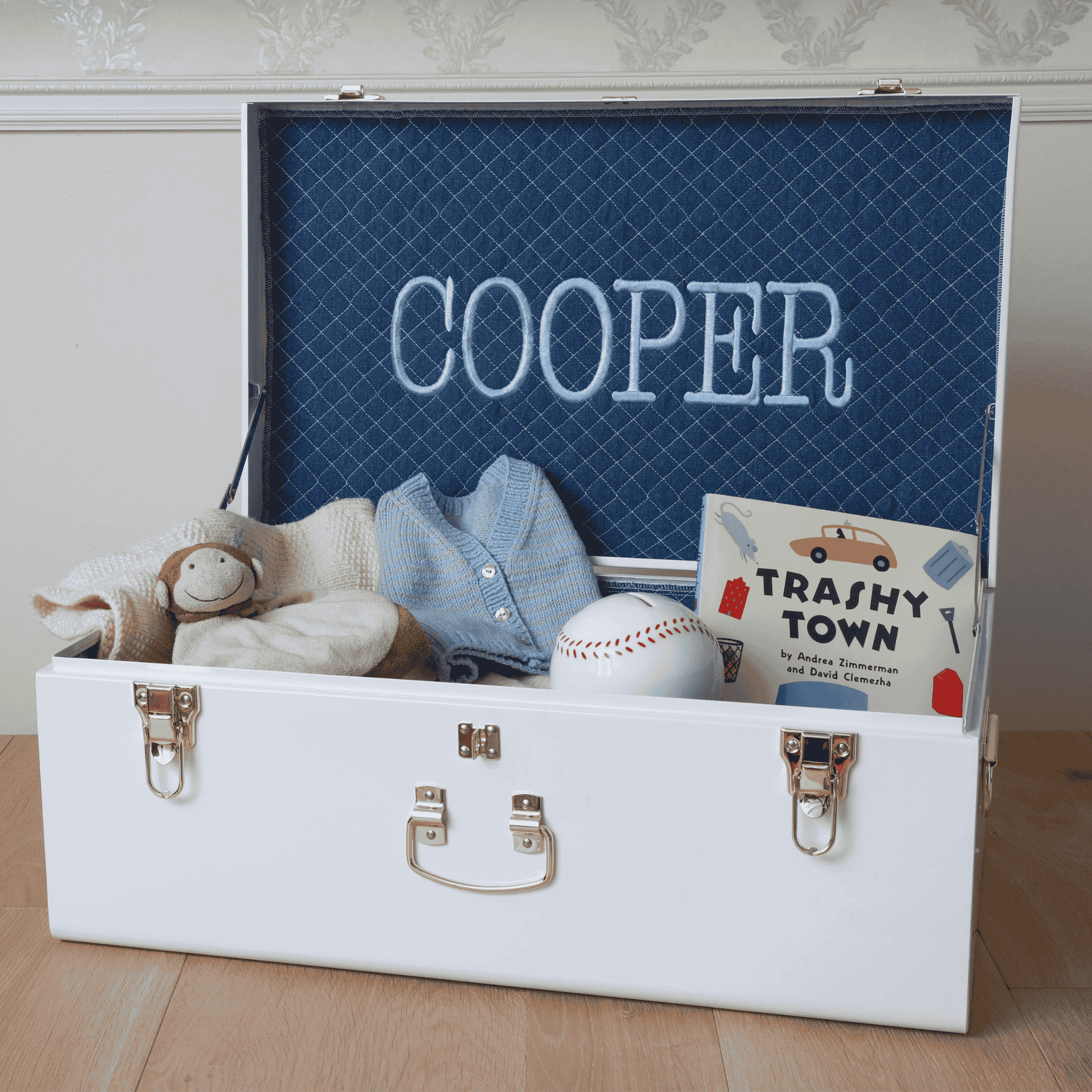 Constructed to hold your stories for generations and made to order with custom personalization, each trunk is designed to hold your baby’s milestones. Memory boxes are a thoughtful, custom gift for baby showers, gender reveals, births, 1st birthdays, golden birthdays, and more. All trunks currently ship with gold hardware.